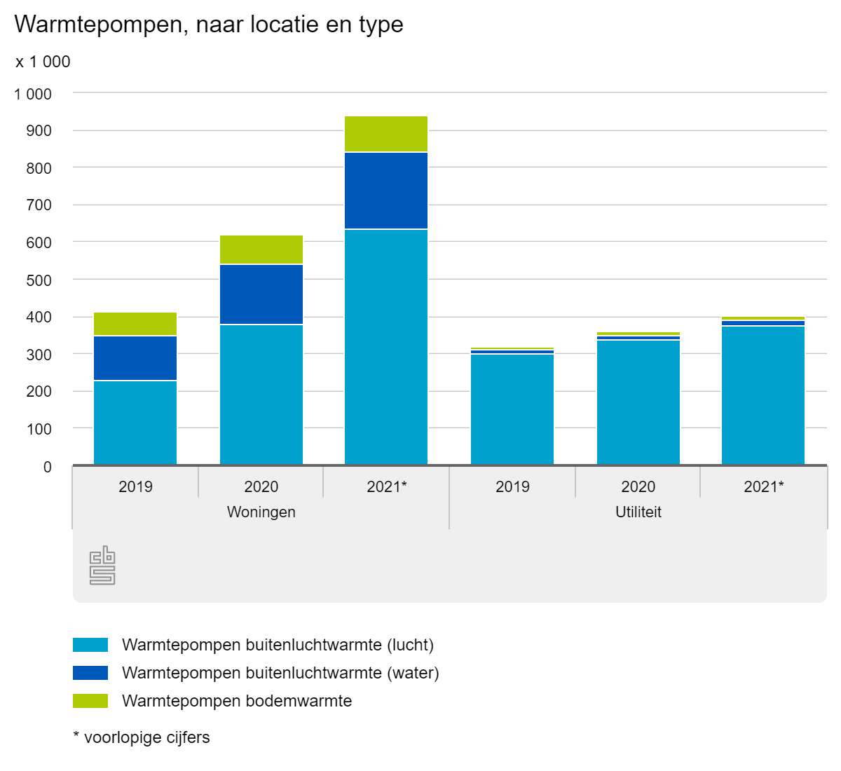 In 2021 stonden er 206 duizend warmtepompen bij woningen die buitenluchtwarmte afgeven aan een verwarmingssysteem op basis van water. Dit is 29 procent meer dan in 2020. De overige 98 duizend warmtepompen bij woningen benutten energie uit de bodem, dit is 25 procent meer dan een jaar eerder. Deze twee typen warmtepompen worden meestal aangeschaft om een ruimte te verwarmen.